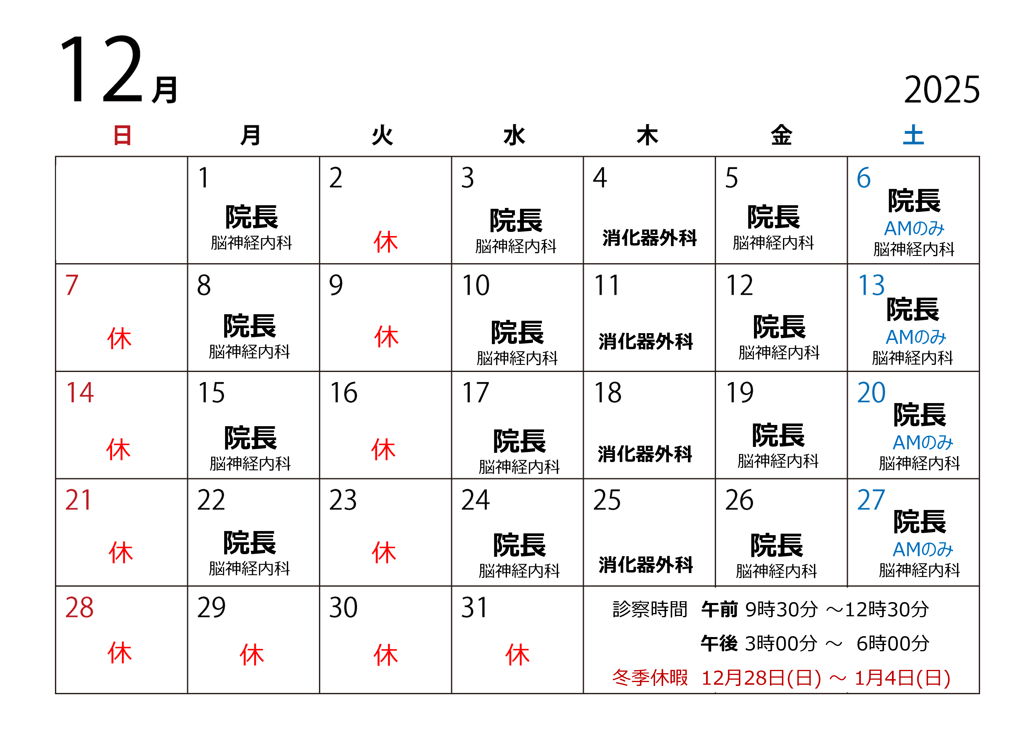12月の診察スケジュール 2025/11/21 受付時間 AM 9:30~12:30 PM 3:00~6:00 初めての方、生命保険会社の診査をご希望の方の受付は、 事前に電話連絡をお願いします。 脳神経内科受診をご希望の方は曜日を確認してからお越しください。 木曜日は、消化器外科系の相談をお受けしています。 検査・治療等はできない場合があります。 都合により、急きょ予定が変更になる場合があります。