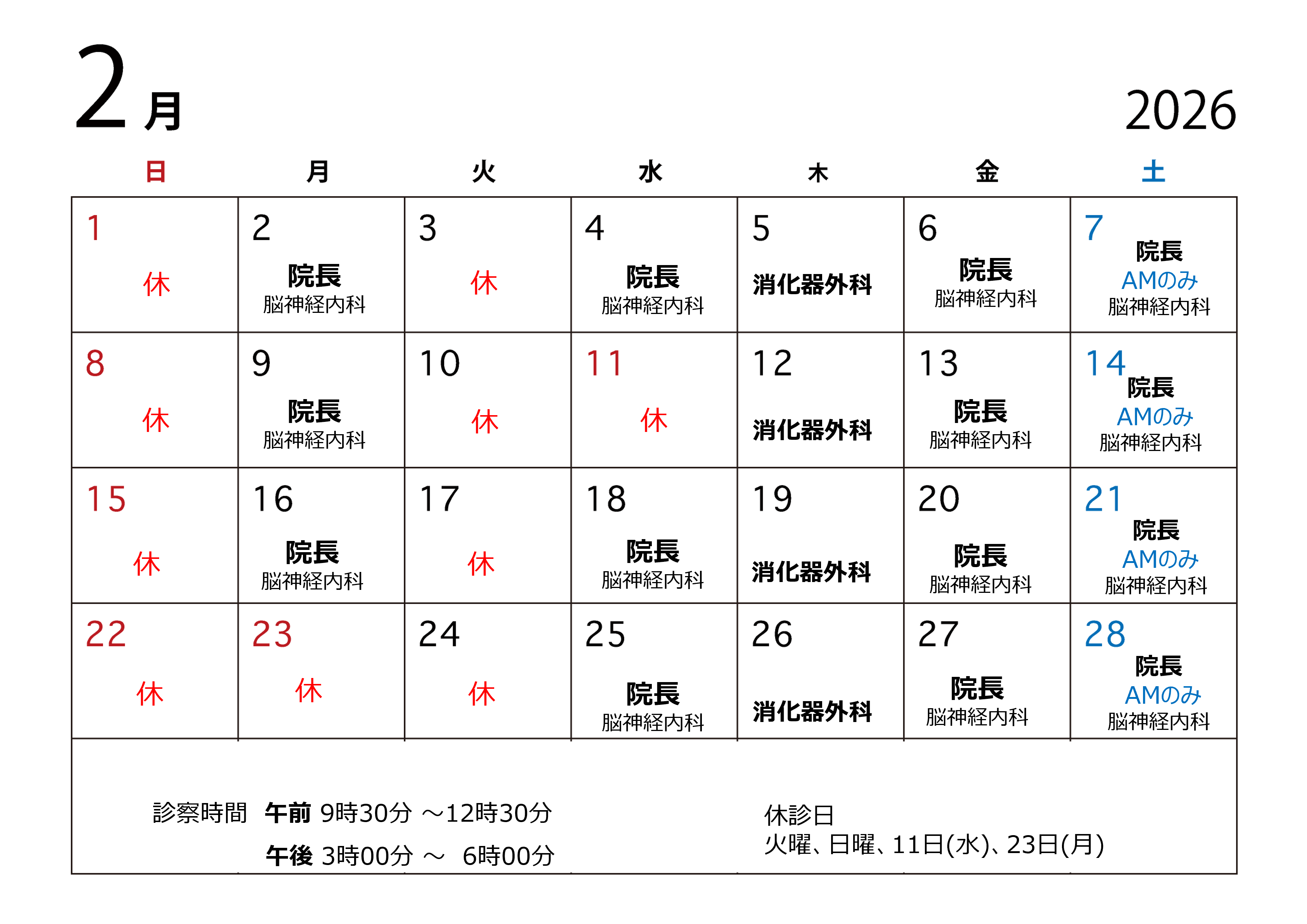 2月の診察スケジュール 2026/01/28 受付時間 AM 9:30~12:30 PM 3:00~6:00 初めての方、生命保険会社の診査をご希望の方の受付は、 事前に電話連絡をお願いします。 脳神経内科受診をご希望の方は曜日を確認してからお越しください。 木曜日は、消化器外科系の相談をお受けしています。 検査・治療等はできない場合があります。 都合により、急きょ予定が変更になる場合があります。