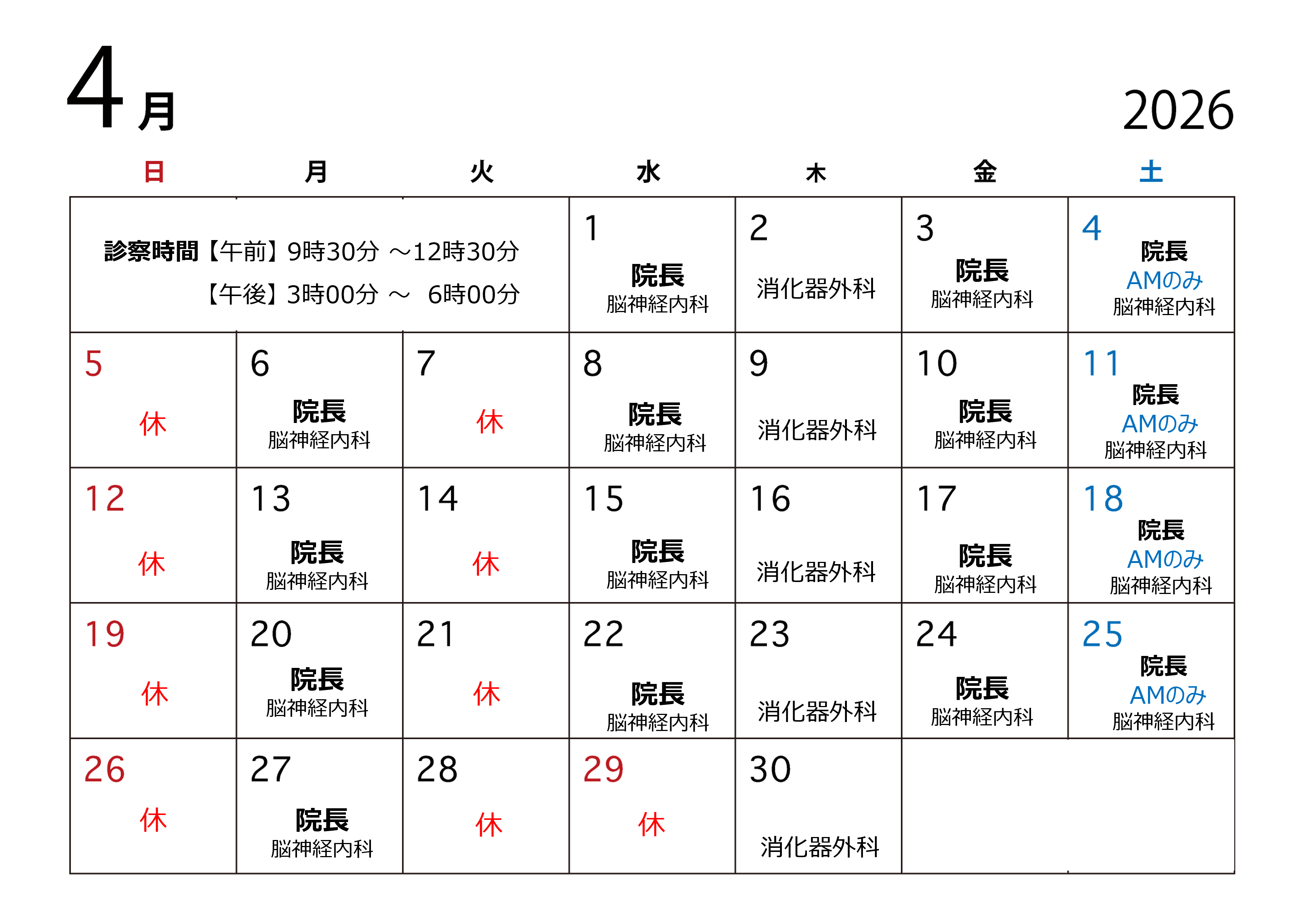 4月の診察スケジュール 2026/03/27 受付時間 AM 9:30~12:30 PM 3:00~6:00 初めての方、生命保険会社の診査をご希望の方の受付は、 事前に電話連絡をお願いします。 脳神経内科受診をご希望の方は曜日を確認してからお越しください。 木曜日は、消化器外科系の相談をお受けしています。 検査・治療等はできない場合があります。 都合により、急きょ予定が変更になる場合があります。